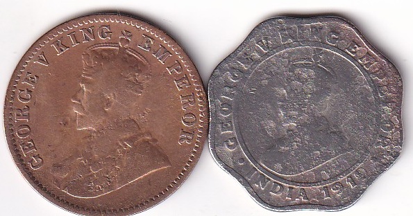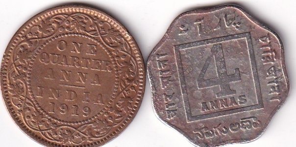 Denomination within square, 4 annas in Urdu, Bengali, Telugu & Devanagari
